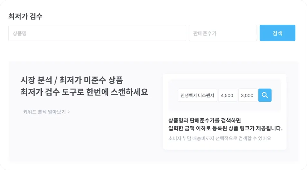 최저가 검수 페이지에서 상품명과 판매준수가를 입력 후, 검색 버튼(Enter)을 클릭해주세요.